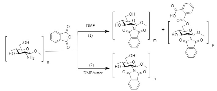 Kurita et al. verwendeten Phthalsäureanhydrid in einer DMF-Lösung mit 5 % Wasser bei 120 °C, um die Pht-Schutzgruppe beim Schutz der Aminogruppe von Chitosan einzuführen, mit einer Ausbeute von >80 %. Unter dieser Bedingung kann die Aminogruppe selektiv geschützt werden, während die Hydroxygruppe unberührt bleibt (Methode 2). Kurita et al. fanden außerdem heraus, dass bei Durchführung der Reaktion in reinem DMF ein Nebenprodukt entsteht, in dem sowohl die Aminogruppe als auch die Hydroxygruppe geschützt sind (Methode 1).