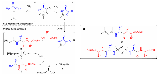 Das Team um Yamamoto, H., entwickelte eine Eintopf-Peptidsynthesestrategie basierend auf einem Fünfringmechanismus. Diese Methode nutzt die Multifunktionalität von Trimethylaluminium voll aus, welches sowohl die Carboxylgruppe aktiviert als auch den nukleophilen Angriff der Aminogruppe koordiniert, wodurch eine effiziente und hoch stereoselektive Peptidsynthese ermöglicht wird.