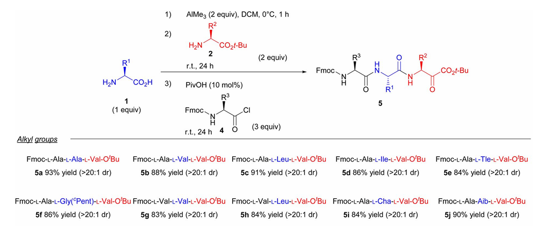 Diese Synthesestrategie zeichnet sich durch eine ausgezeichnete Funktionalgruppenverträglichkeit aus, ist tolerant gegenüber Aminosäuren mit Seitenketten sowie Aminosäuren mit Estergruppen, Etherbindungen und schwefelhaltigen Gruppen und liefert eine hohe Reaktionsausbeute. Während des gesamten Syntheseprozesses wurde keine nennenswerte Racemisierung beobachtet, und die Stereoselektivität ist gut.